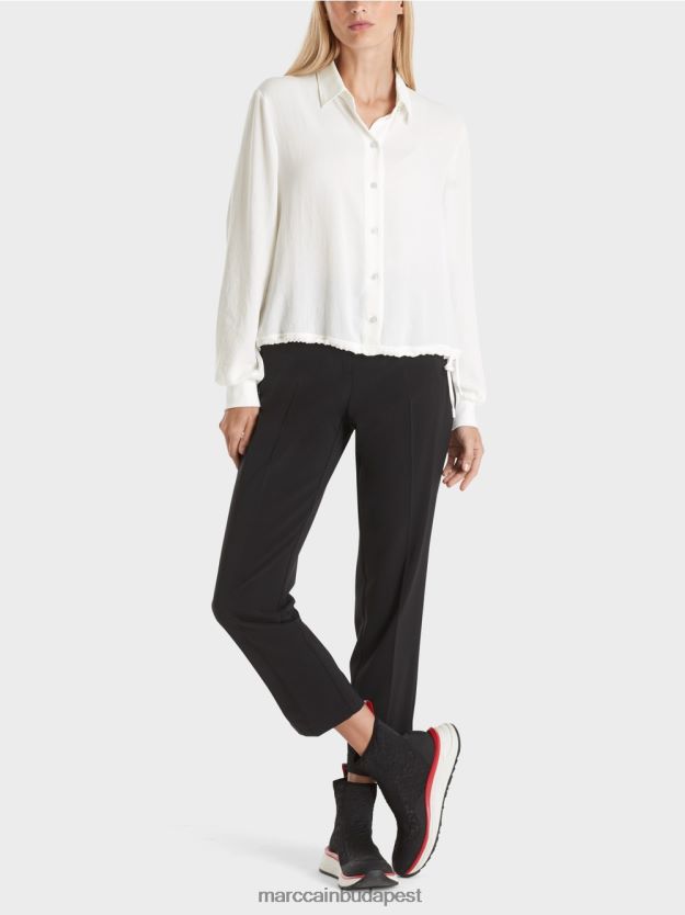 A blúz lágyan leeső anyagból készül. A formatervezésnek van a pillanata a húzózsinórban. Ez lehetővé teszi a hatékony variációkat. Az ujjak kötött mandzsettákkal végződnek. A háttal ingszerűen oldják meg a vállát és a redőt.