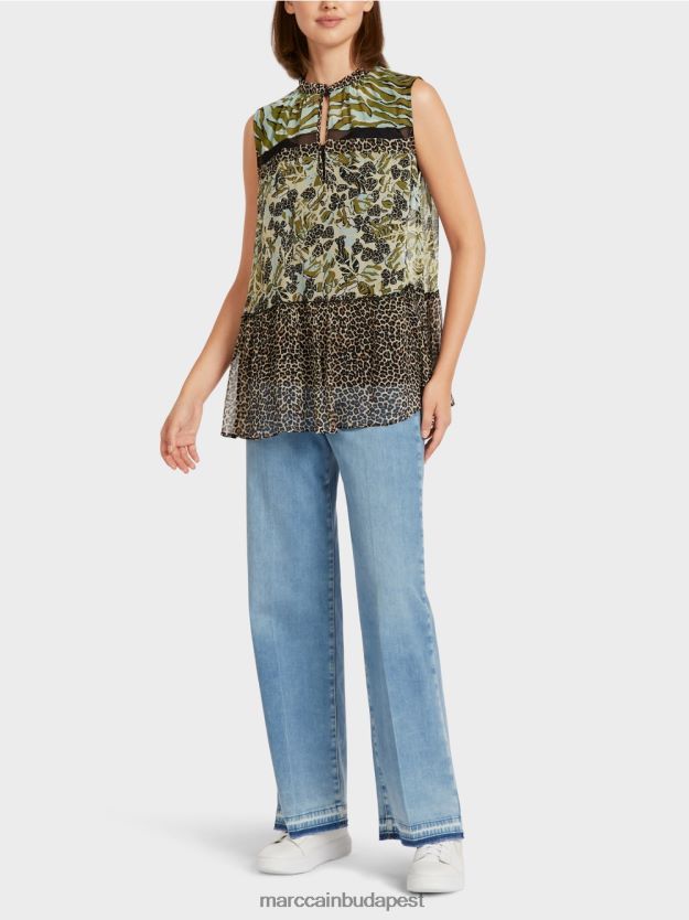 Ez a többszintű teteje finom viszkóz kreppből készül. A képzeletbeli mintát a növény- és állatvilág motívumok ihlette. A háló és a leopárd nyomtatási csíkok elöl adnak ki akcentusokat. Az stand-up gallér kissé összegyűjtött, és egy gombbal és hurokkal rögzül.