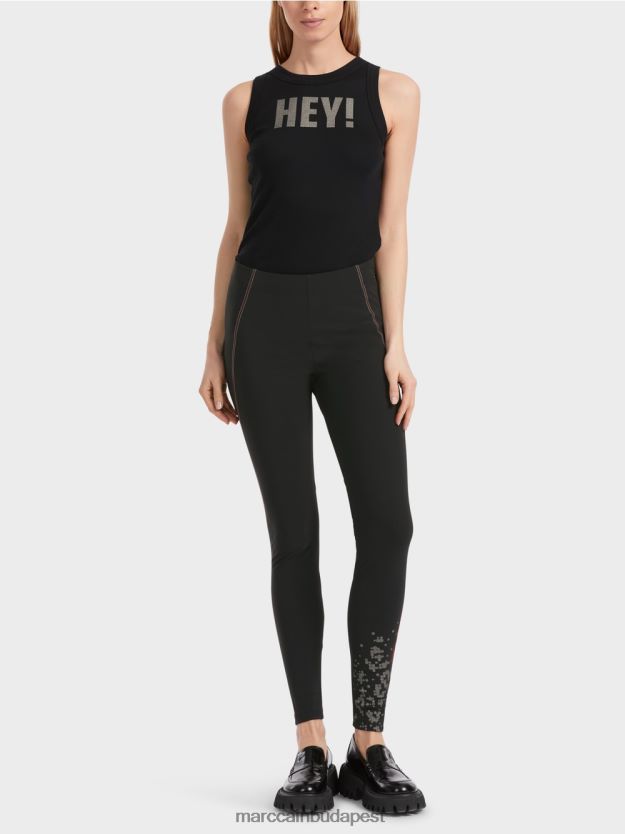 A nadrágok magas elasztántartalommal rendelkező anyagból készülnek. Ezáltal könnyedén elcsúsztak. A sportos megjelenés kontrasztos dekoratív varráson és a bal oldalon a aszimmetrikus techno-nyomtatás motívumán alapul.