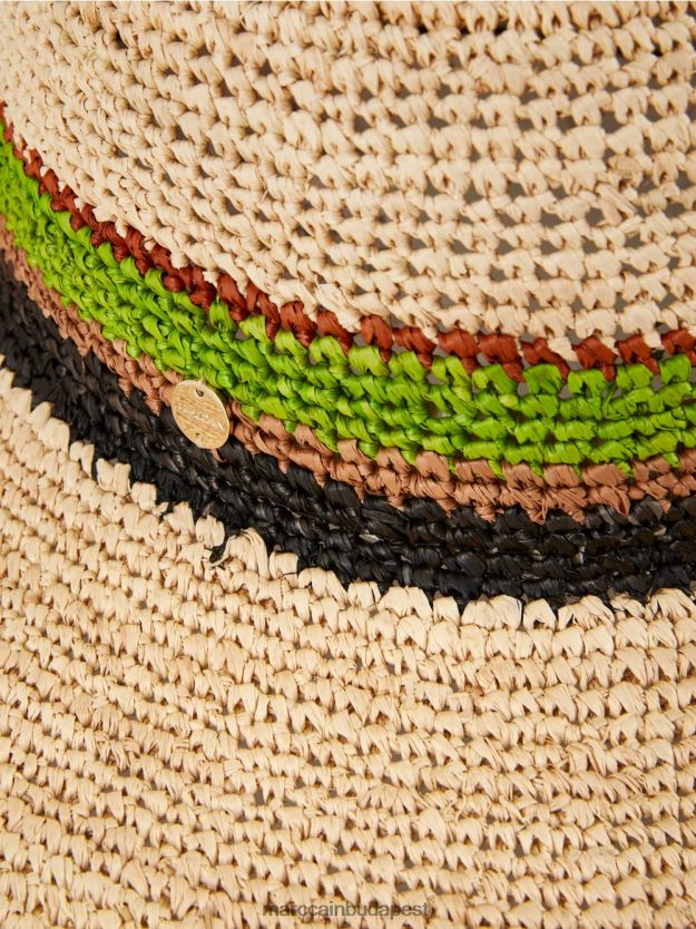 Ez a napsütés egy kagyló kalap lekerekített alakját egyesíti egy széles karimával. A kalapsávot kontrasztos színű szőtt csíkok váltják fel. Ez az elem természetes szalmából készül.