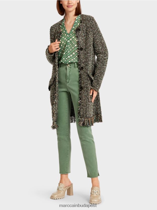Alkalmi kötött kardigán egy gyapjúkeverékben az alpakával. Ez a kardigán kiemelkedik a színes kialakítás és az alkalmi, sokoldalú rojtok miatt. Széles legénység nyaka van. A nagy perjel fedél zsebek javítják a kényelmet. Ez a kialakítás három gombbal rögzül.