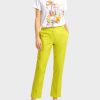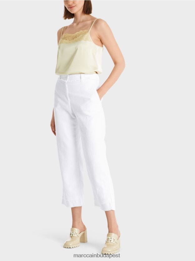 Alkalmi nadrág texturált pamutban nyújtott tartalommal. Ezeknek az egyenes vágású nadrágoknak nyári ágyneműje van. A szegélyek és a derékpánt rojtok alkalmi részleteket adnak. A ZIP légyet virággomb díszíti. Két oldalsó zseb és két hátsó zseb az ülés területe alatt megerősíti a sportos kialakítást.