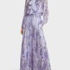 Elegáns nadrág, extra széles lábú. A szélesség csak a csípőből jelenik meg, mivel a derékpántnak van pintucks, és a derék redők dartsokkal készülnek. A szövött csík a formatervezésben váltakozó átlátszó és átlátszatlan hatást eredményez egy látványos Wisteria nyomtatásra. Mivel vastagabb az alsó felé, a minta hangsúlyozza a nadrág szegélyét. A szőtt csíkot csillogó szálak hangsúlyozzák.