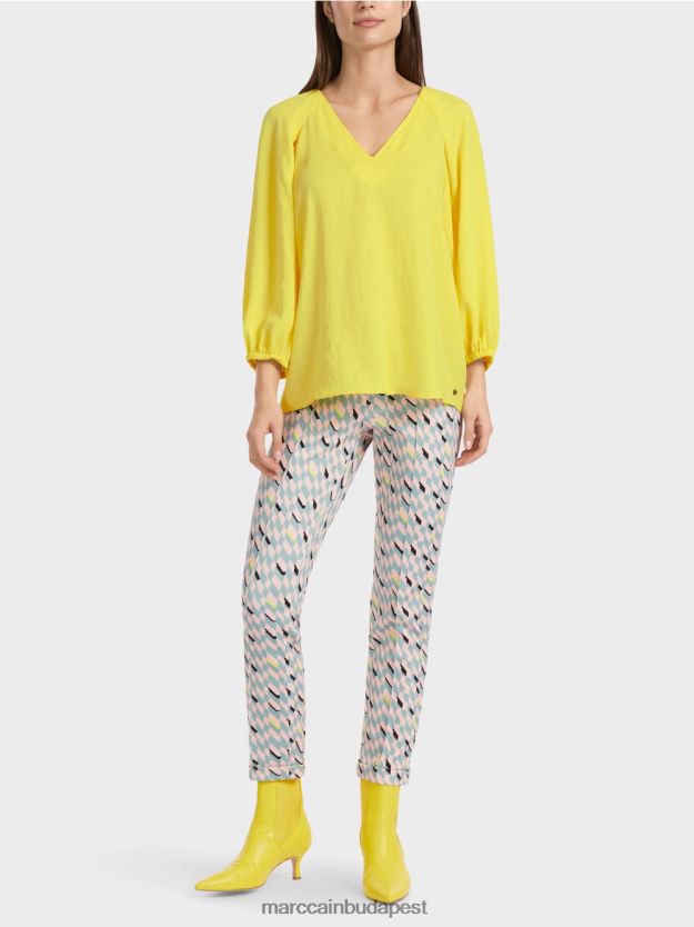 A lágy anyagból készült blúz véletlenszerűen drapálása. Ez a blúz nagymértékben gólt szerez egy sportos V-nyakkal. Megfelelően rugalmas mandzsetta van az ujján. A széles raglan hüvelyek kiegészítik az egyenes vágást.