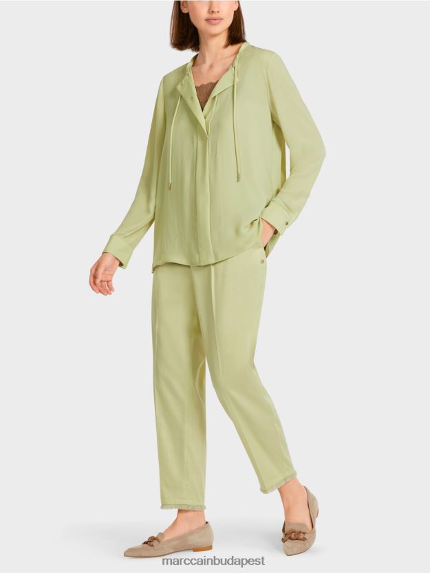 Minimalista tervezés. Ez az elegáns blúz újrahasznosított poliészter keverékéből készül, és a “Rethink együtt” fenntarthatósági címkét viseli. A húzózsinór -alagút integrálódik a nyakkivágásba, hogy szalaggal rögzíthető legyen. A gombos plagét a dekoratív gombok állítják el. A blúz hátul kissé összegyűjti.
