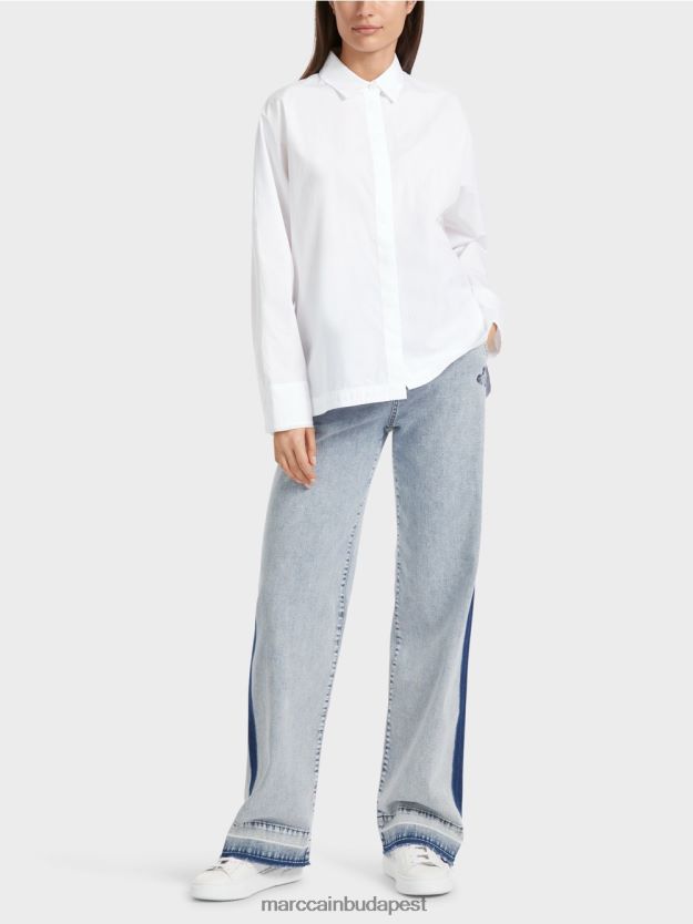 A blúz organikus pamutból készül, és a “Rethink együtt” fenntarthatósági címkét viseli. Stilisztikai szempontból a nyugati és a keleti ruházati hagyományok találkoznak. A kimono vágás kiveszi a súlyosságot az ing gallérból és a rejtett gombos placketből. A szegélyt a kiemelkedő varrás és az oldalsó rések hangsúlyozzák. Hátul a blúz minimalista nyomtatási motívummal rendelkezik.