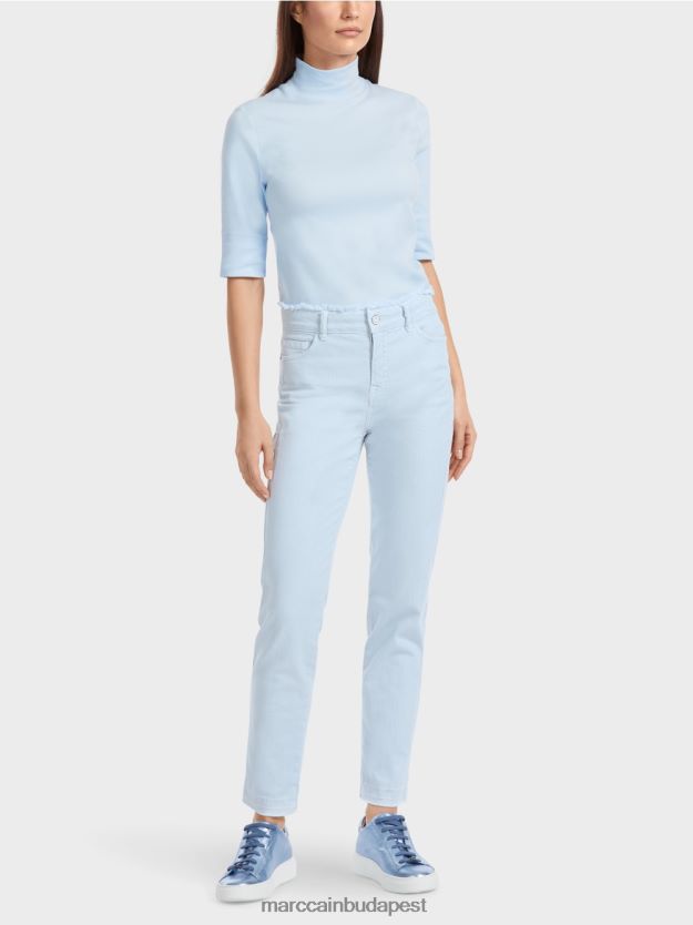A farmer Silea -t készítik Organic pamut és viselje a “Rethink együtt” fenntarthatósági címkét. A vágás keskeny és a láb alakja a szegély felé kúpos. A divatos tulajdonság a sötét és rojtos szegély, amely úgy néz ki, mintha a nadrágot barkács stílusban meghosszabbították volna. A zsebtől a térdig – az oldalsó varrásval párhuzamosan – egy dartot futtat. A bal hátsó zseb a Marc Cain betűk M -jét hímzett variációban viseli.