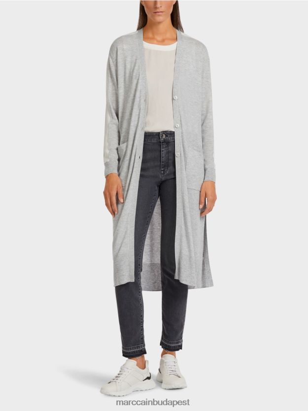 Magas viszkóztartalommal rendelkező fonalból készült, ez a midi-hosszú kardigán folyó sziluettje van – A magas oldalsó rések megadják a szükséges mozgás szabadságát. A kardigán túlnyomórészt klasszikus formatervezésben sportos érintést kap a kontrasztos bordázott és színes betétek a vállakban, az ujjakban és az oldalsó varrásban.