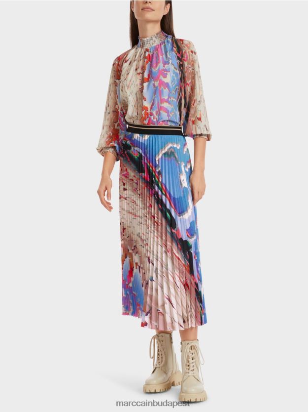 Újrahasznosított anyagból készült lágy, áramló szoknya. Ez a színes nyomtatott szoknya nőiesen bemutatja a redős redőkkel. A midi hosszúság okosan játszik a lábak körül. A rugalmas bordázott derékpánt dekoratív csíkokkal biztosítja a kényelmet. A belső bélésnek köszönhetően a szoknya mindig tökéletesen illeszkedik.