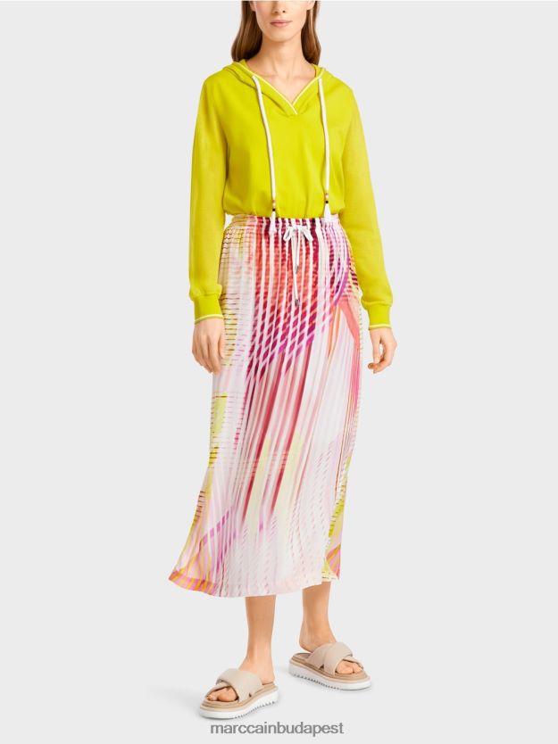 Lágyan drapped viszkóz szoknya. Ez a szoknya nyugodt nyári megjelenéssel büszkélkedhet színes csíkos mintájával aszimmetrikus elrendezésben. Van egy kissé fellendült sziluettje, oldalsó hasítással. A rajzolt derékpánt húzózsinórral egész nap kényelmes illeszkedést biztosít.