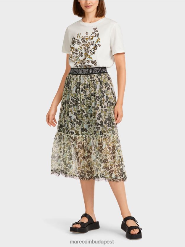 Ezt a széles lendületes szintű szoknyát az 1970 -es évek etnikai stílusa ihlette. A viszkóz krepp kissé áttetsző és a ruhadarab bélelt. Rugalmas derékpántja van. A szemet gyönyörködtető funkció az extravagáns nyomtatás, amely a stilizált állati bőr motívumokat ábrázolja virágos érintéssel. Ezzel ellentétben a leopárd nyomtatás a szegélyre.