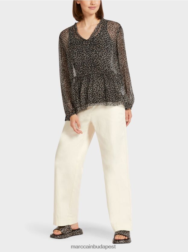 Ez a teteje túlméretezett és ultra-finom viszkóz kreppből készül. A szélességet a derékon lévő húzózsinórral állíthatjuk be. Az ujjak szintén laza és rugalmas húzózsinórral készülnek. A V-nyak és a szegély egy nyers szélű kivitelű csapdával készül.